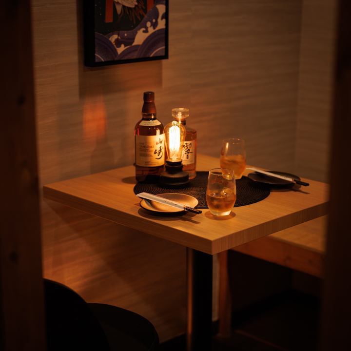 障子風の扉と木の質感が心を落ち着かせる隠れ家のような個室空間!やわらかな照明と壁に飾られた和アートが、上品でありながら温かみのある雰囲気を演出します!プライベート感はしっかり守られているので、大切な人とのデートや記念日、友人との飲み会にピッタリです!当日予約・席のみ予約も受付けております!